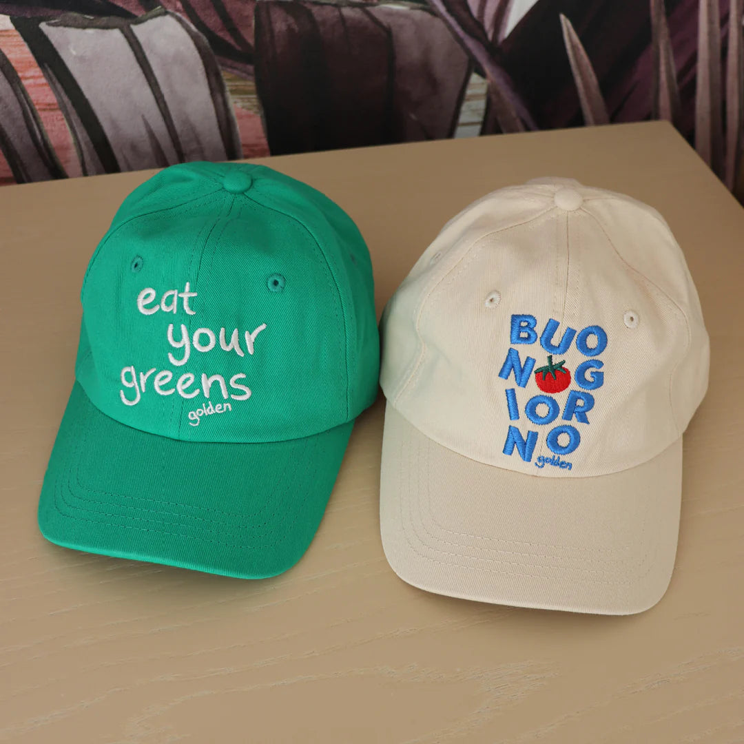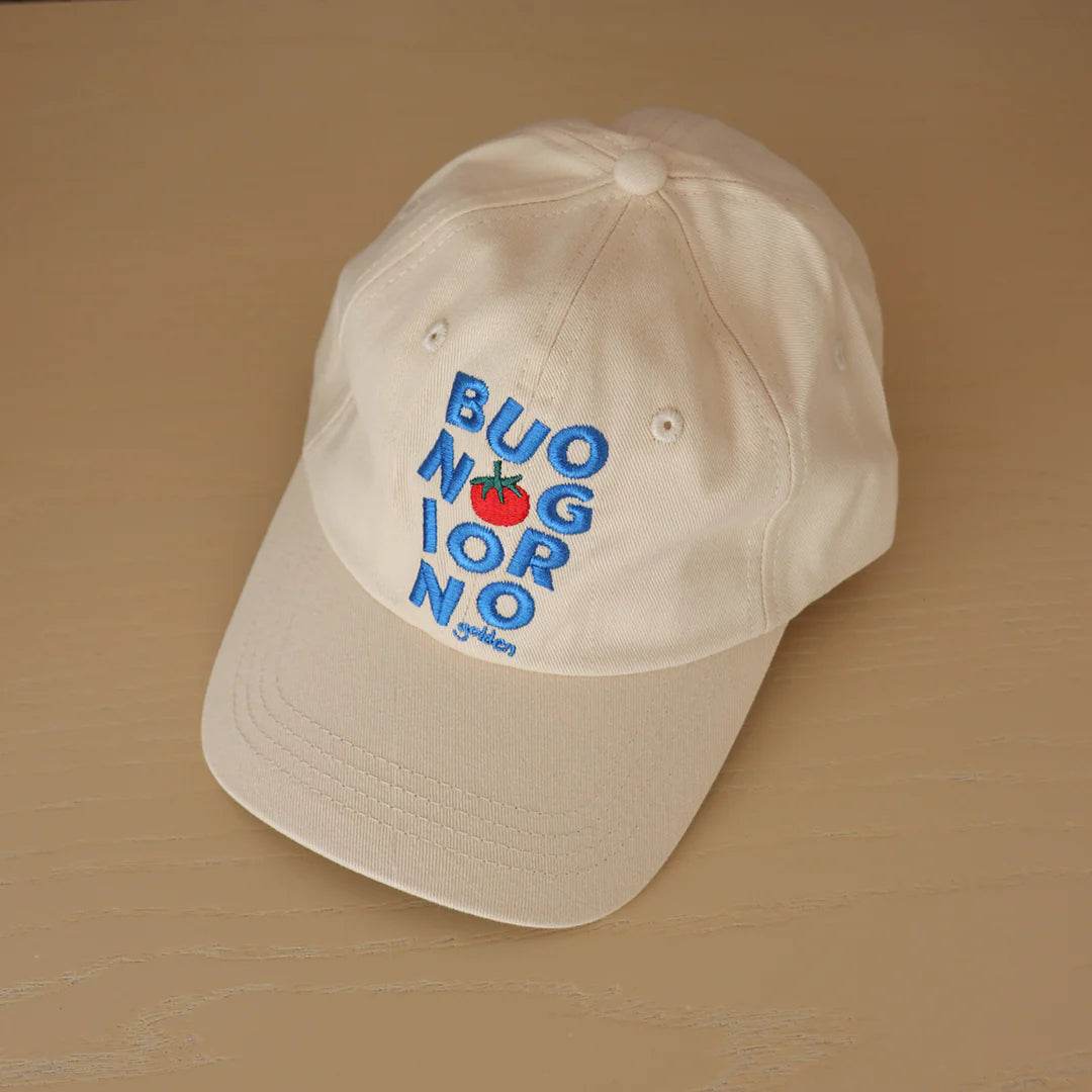 The cap features the letters spelling ‘BUONGIORNO’ and a tomato embroidered to the front with the Golden logo embroidered to the back. It is adjustable with a brass clasp to the back.