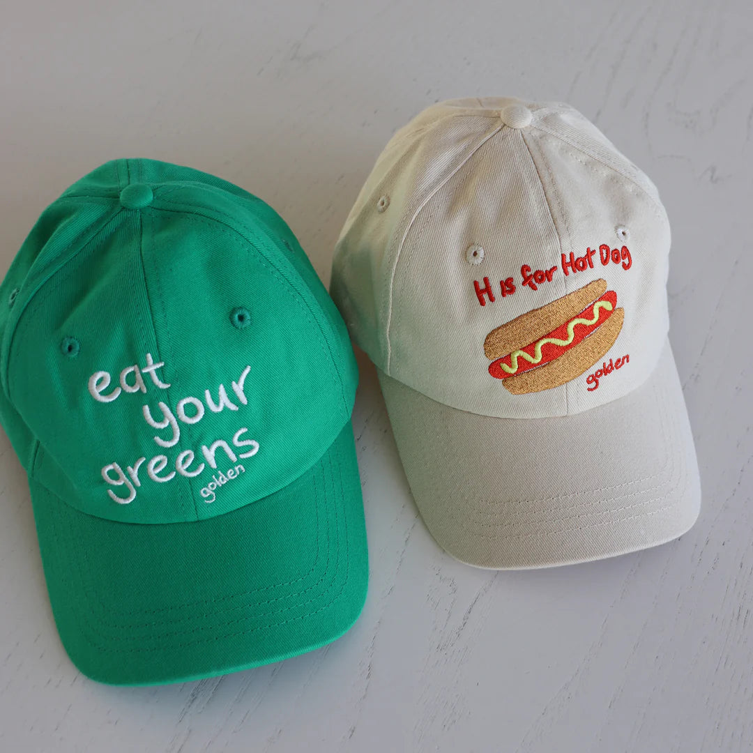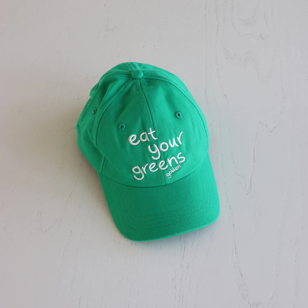 The cap features the words ‘Eat Your Greens’ embroidered to the front with the Golden logo embroidered to the back. It is adjustable with a brass clasp to the back.