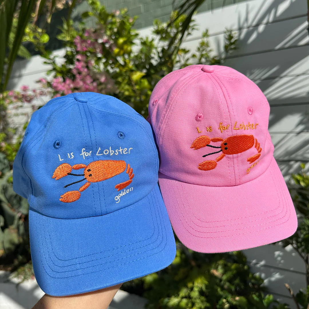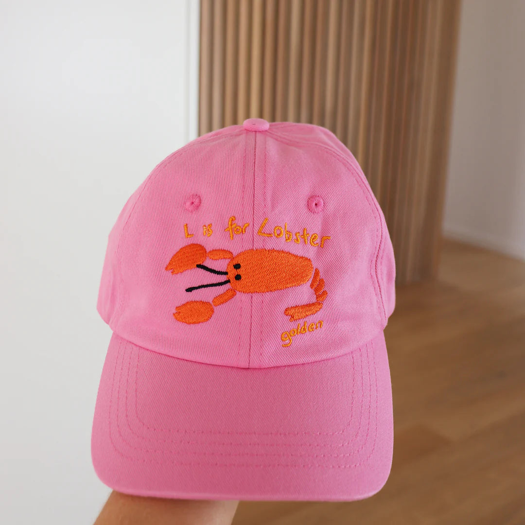 The cap features L is for Lobster and a friendly lobster embroidered to the front and the Golden logo embroidered to the back. Is is adjustable with a brass clasp to the back.