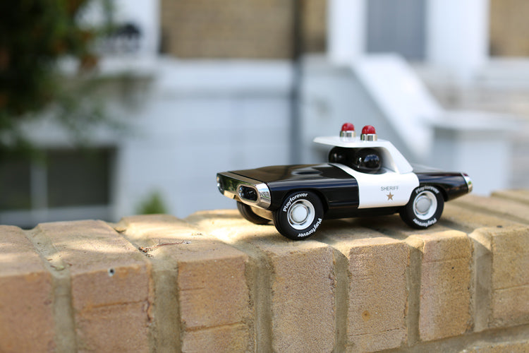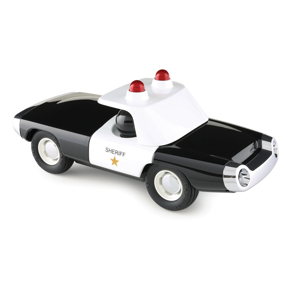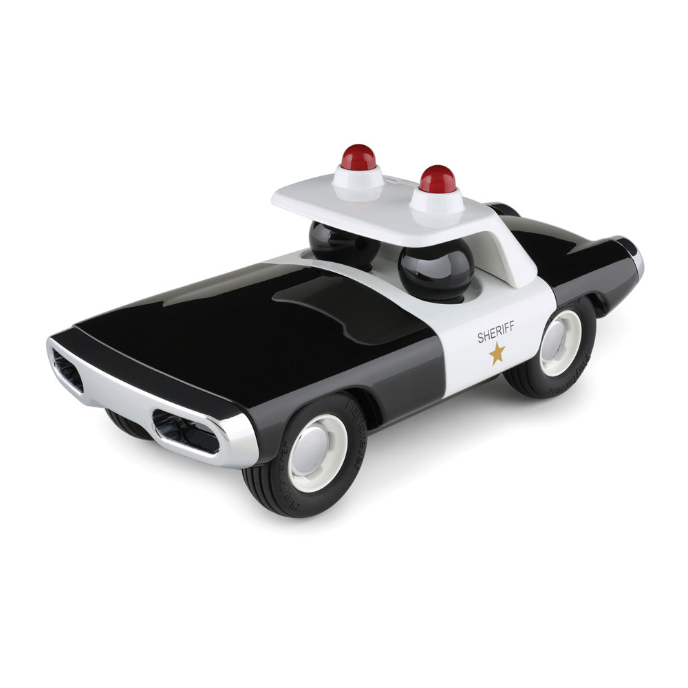 Constructed from heavy duty plastic with moving rubber wheels and designed in the UK, the Maverick Heat Black and White is a blast from the past. Retro lines styled on the Ford Thunderbirds of the 60's, the Black and White has a chrome grill and wheel rims and white banding which follows the roof line with sheriff badging including a gold star on the doors. Complete with two red police lights on the roof, this Thunderlane is reminiscent of a typical black and white vintage police car. Perfect for the playroom, it is solid enough for everyday play or leave it on the shelf as stylish room decor!