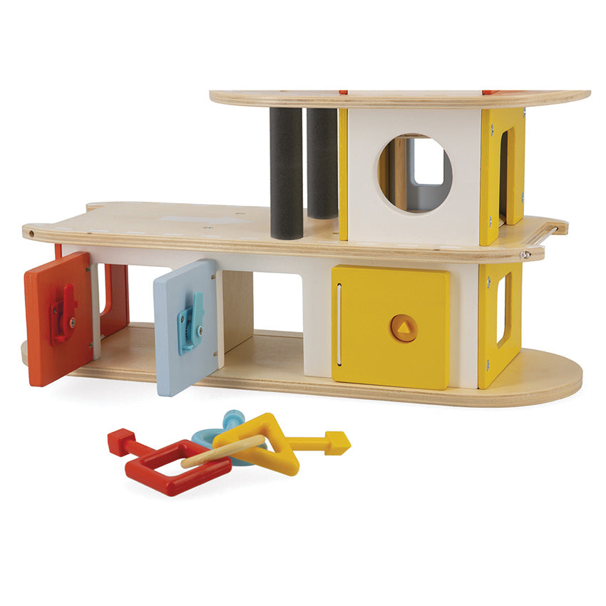 Made from FSC® certified wood with child-safe, water-based paints, the garage is robust, eco-friendly, and easy to assemble with a jigsaw-style cardboard circuit. Colour-coded keys, geometric shapes, and moving parts make learning playful and intuitive—perfect for home play, classrooms, and childcare settings.