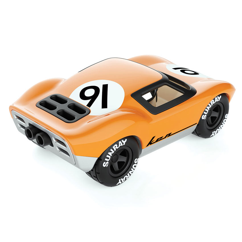 Ken Gibson is a meticulously engineered racing marvel, inspired by the iconic American cars of the late 60s and 70s. This dream machine showcases sleek curves in glossy retro orange, contrasted by black dual rear exhausts, 5-spoke wheels, and stylish trims. With a racing number roundel proudly displayed, Ken Gibson is ready to hit the track. The driver, equipped with a chrome helmet, is eager to race and already practicing that winning podium pose!