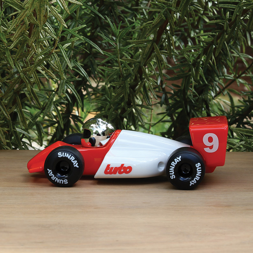 Turbo Lauper is bright red-orange and white with massive air ducts and bold graphics. Matching box wings and chrome helmet complete the tangible aesthetics Playforever is famous for. Reminiscent of Formula 1 in the 80's, the Playforever Verve Turbo series has authentic design with a flawless finish. Solidly constructed from heavy duty plastic with high gloss UV-resistant paint and rolling smoothly on soft rubber tyres, they look just as good on the shelf as they do at play. You may not be able to buy the real thing, but Playforever's Turbo series is sure to bring delight to any toybox, mantelpiece, office or man cave.
