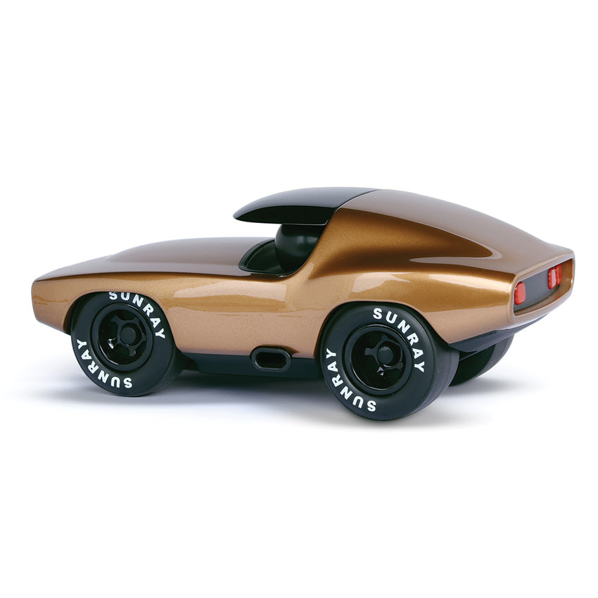 Reminiscent of a classic fastback car, the sleek aerodynamic lines and burnished gold paint will make the owner of the Verve Lead Belly Burnside the envy of everyone in the street! Constructed from heavy duty plastic with moving rubber wheels rimmed with gold and designed in the UK, Burnside is shimmering gold all over with a black roof and bumper. Solidly built for everyday play, Burnside is perfect for the playroom or leave him on the shelf as stylish room decor. Car enthusiasts will love him too as the Playforever range always has a flawless finish in UV-resistant paint and is crafted with attention to detail.